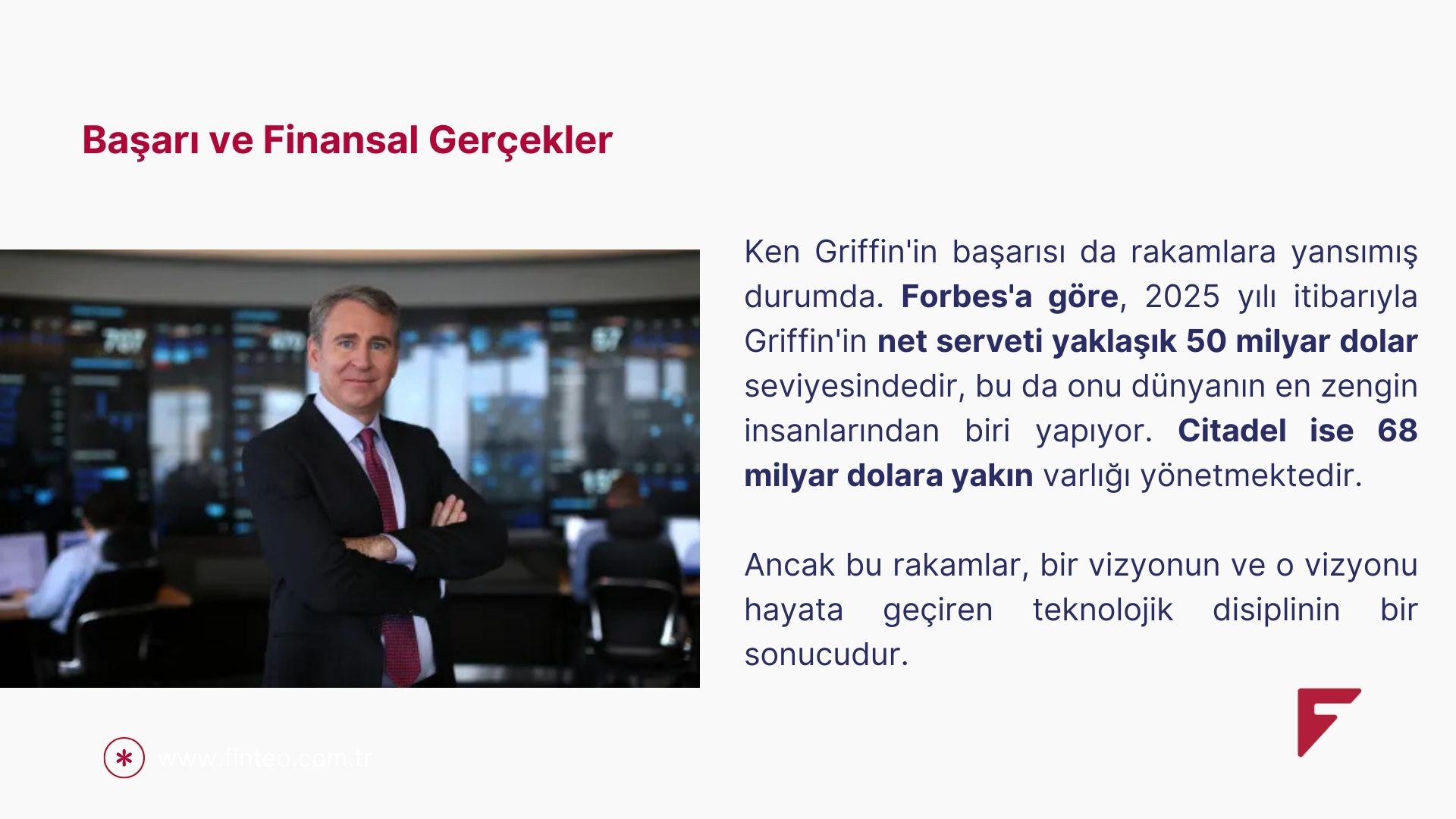 Ken Griffin'in başarısı da rakamlara yansımış durumda. Forbes'a göre, 2025 yılı itibarıyla Griffin'in net serveti yaklaşık 50 milyar dolar seviyesindedir, bu da onu dünyanın en zengin insanlarından biri yapıyor. Citadel ise 68 milyar dolara yakın varlığı yönetmektedir.