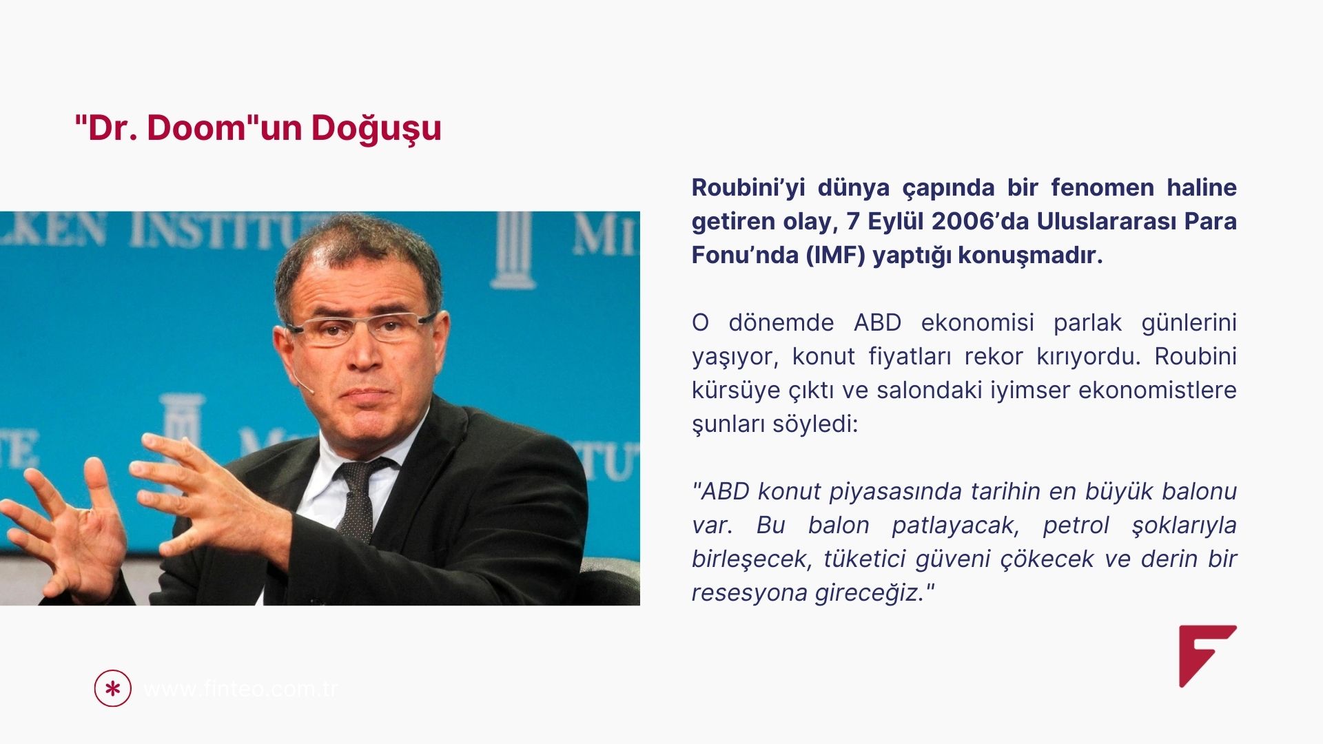 Roubini’yi dünya çapında bir fenomen haline getiren olay, 7 Eylül 2006’da Uluslararası Para Fonu’nda (IMF) yaptığı konuşmadır. O dönemde ABD ekonomisi parlak günlerini yaşıyor, konut fiyatları rekor kırıyordu.